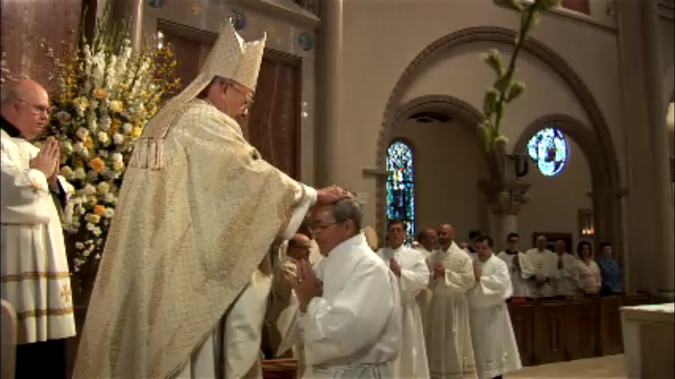 Laying on of Hands by Bishop Deshotel. (Screenshot from the live feed of the Mass)