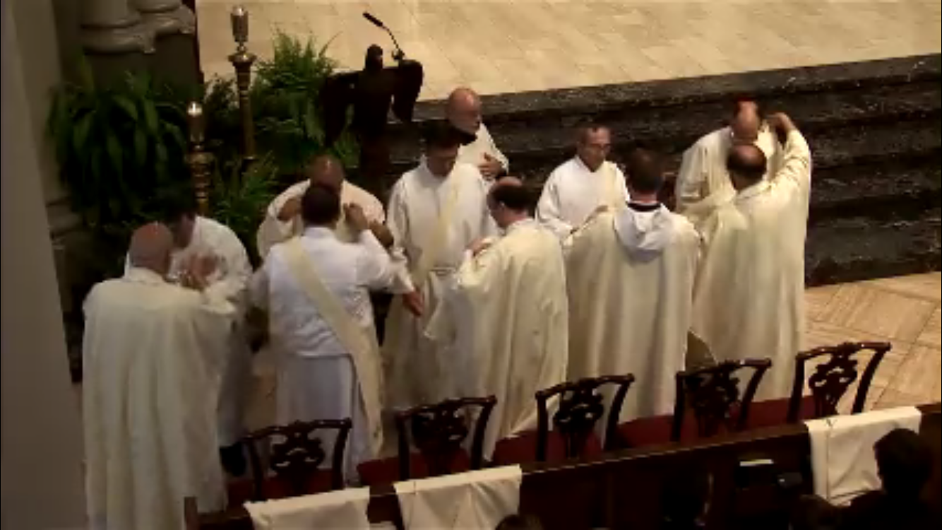 Investiture of Stole and Dalmatic. Deacon Soileau is the second from the right. Fr. Guidry is investing him with the stole and dalmatic. (Fr. Tom Voorhies, in the center, is investing a deacon, too.) (Screenshot from the live feed of the Mass)
