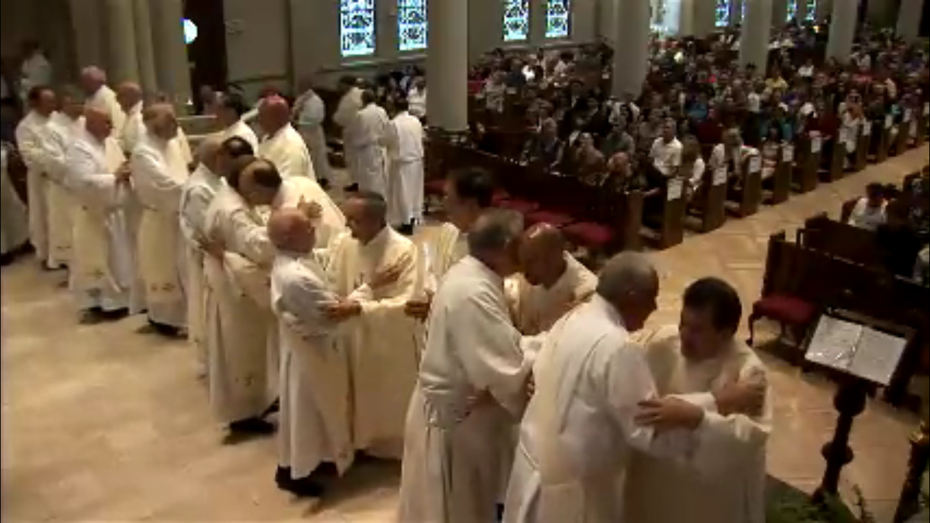 Deacon Gene LeBoeuf (in center) give the Kiss of Peace to Deacon Soileau. (Screenshot from the live feed of the Mass)